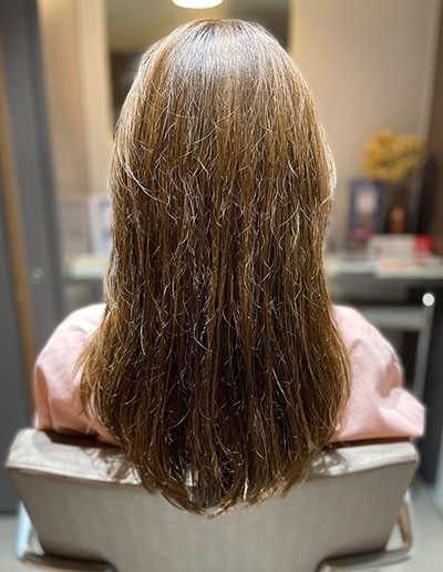 ブリーチやカラーを繰り返して傷んでしまった髪や、艶が低下しボリュームダウンした年齢髪にも、驚くほどの艶とコシが生まれる効果がありました。
