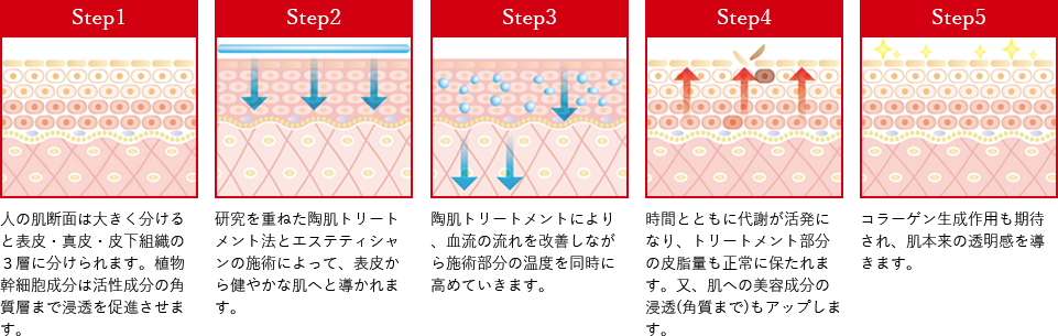 健やかな肌の自己再生能力を維持するのに大切な働きをするのは、皮膚細胞の原点「皮膚幹細胞」です。陶肌トリートメントによりターンオーバーを正常に保ち、植物幹細胞エキスが皮膚幹細胞を活発化します。