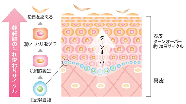 表皮幹細胞より表皮細胞が作り出され、ターンオーバーにより角質層まで押し上げられ肌が新しく生まれ変わっていきます。肌代謝が規則正しく行なわれる事により、健康な肌が保たれます。ターンオーバーは「キレイな角質層を育てるために大切な過程」です。