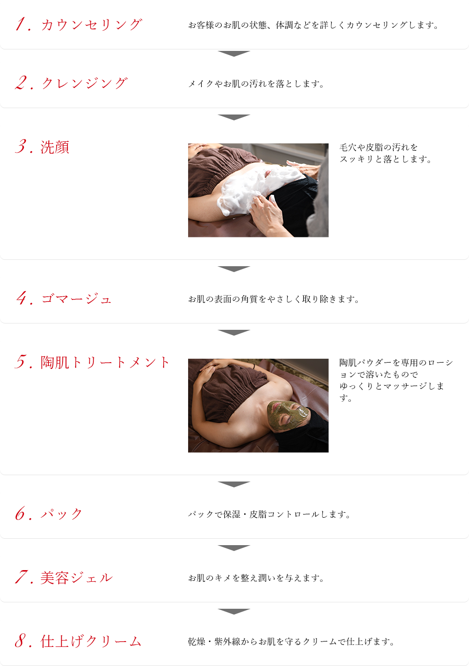 植物幹細胞成分や天然植物由来の植物エキスを施術しながら肌に送り込み、陶肌パウダー(太古の砂と柿葉粉末、植物エキスなど、日本人の肌に合った最適な割合でブレンドした貴重なオリジナル原料)でマッサージすることにより肌本来が持っている力を活性化させ、美しい肌へ生まれかわらせるトリートメントです。